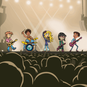 Amy, the versatile lead singer from the USA, inspires with her energy and passion.- Ace, the dynamic drummer from South Africa, keeps the beat going, showing the importance of rhythm and persistence.